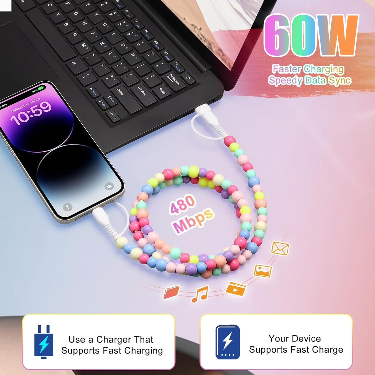 Colorful Beaded Designs: Playful USB C cable features charming colorful beads with stars and hearts, creating a stylish accessory while protecting the cable from tangles. Very suitable for women girls and ideal for gifts