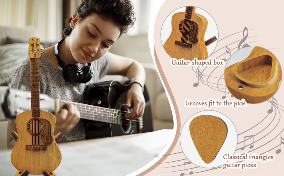 The wooden acoustic guitar box can holds 3 wooden guitar picks or 8 plastic toggles.