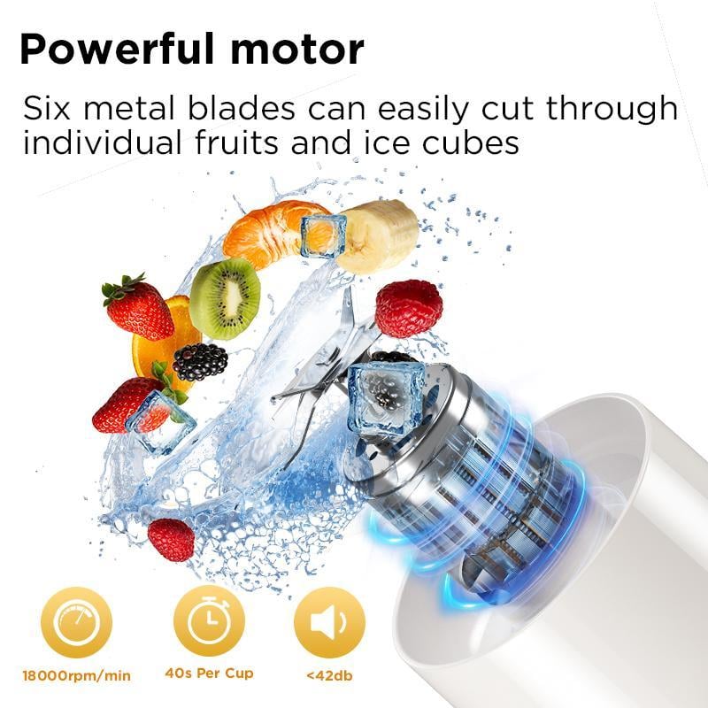 Thisportable blender features a 27-ounce large capacitywhich can meet your daily blending needs. Whetheryou're making juices, smoothies, baby food, or otherblended drinks, it can handle it all in 40 seconds. With itspowerful motor and 10-blade system, it can easily blendvarious ingredients evenly,ensuring smooth-texturedbeverages and foods.
