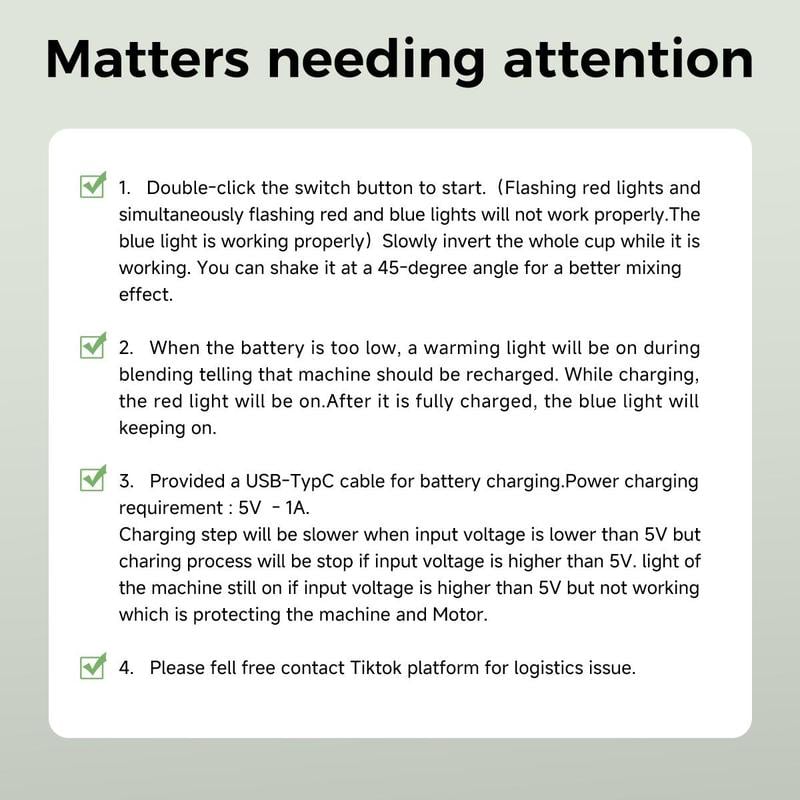 Thepersonal blender is designed to be compact andlightweight, making it very beautiful. Featured a smartsafety lock, if the cup tilts or the lid isn't tightly screwedon, the blender's motor will stop automatically. Extremelysafe. With silicone straws, With a shoulder strap, youcan carry the portable blender anywhere, which is veryconvenient and rare.